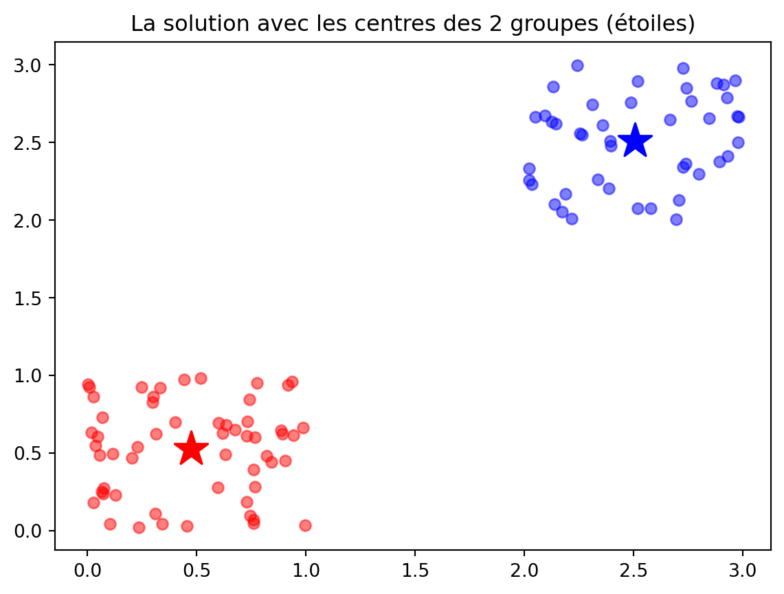 plt.title("La solution avec les centres des 2 groupes (étoiles)")