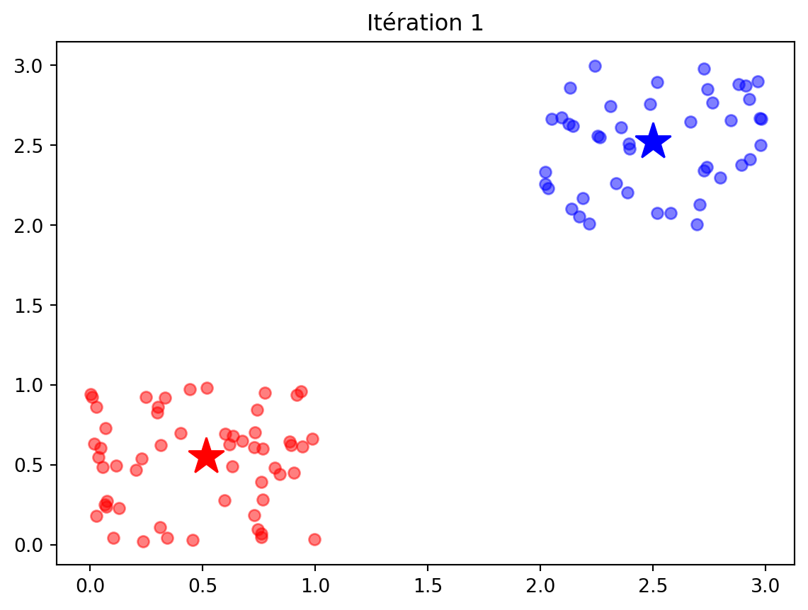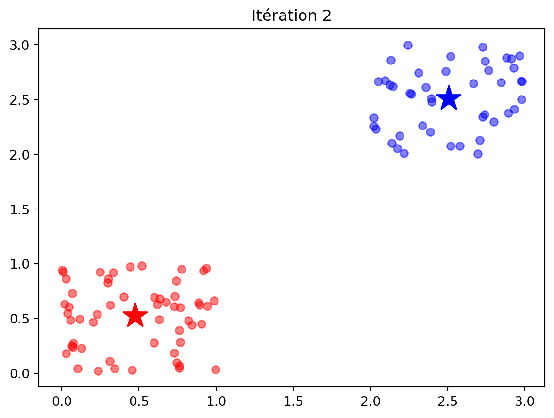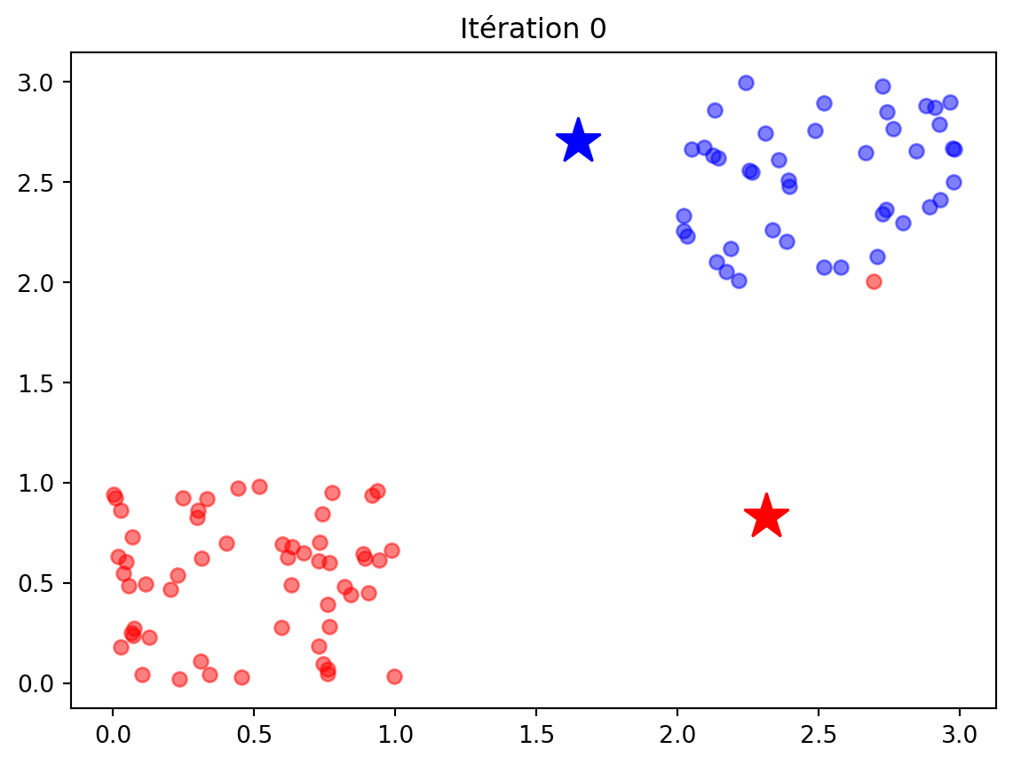 Pour être complet, l’algorithme devrait inclure la gestion des cas où aucun point n’est affecté à un groupe. Typiquement, il est possible de réinitialiser le centre du groupe aléatoirement ou de supprimer complétement le groupe du reste de la procédure.