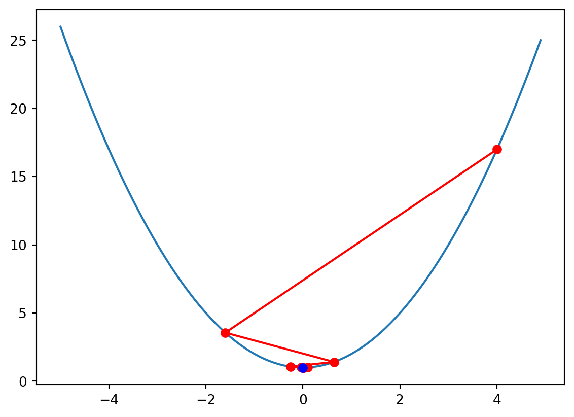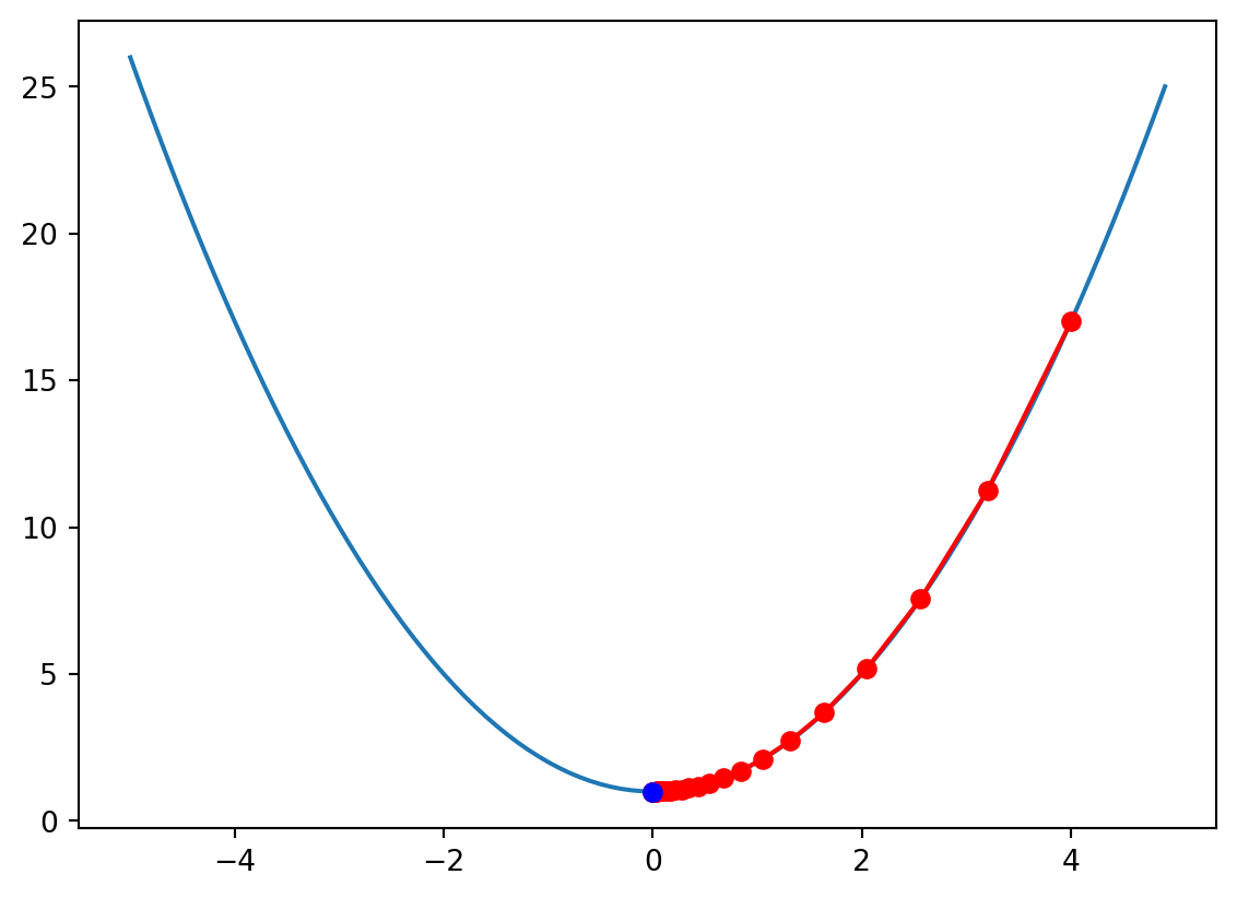 x = 4.00000, f(x) = 17.00000, df_df(x) = 8.00000