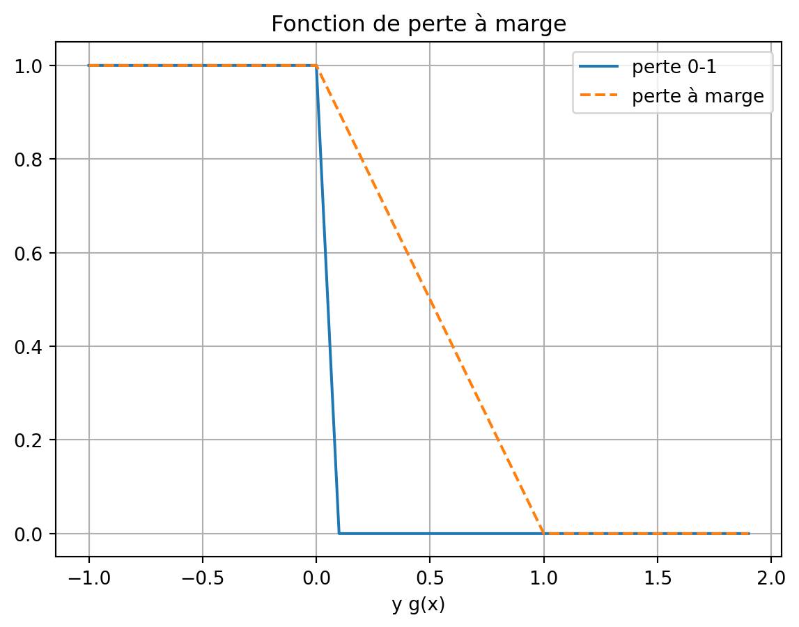 Pour une marge \gamma \geq 0, la fonction de perte à marge est donnée par \ell_{\gamma}(f,x,y) = \varphi_{\gamma}(yg(x)),\qquad \varphi_{\gamma}(u) = \begin{cases}1 ,&\text{si } u \leq 0 \\ 1 - \frac{u}{\gamma},& \text{si } u\in(0,\gamma)\\ 0, & \text{si } u\geq \gamma\end{cases} et elle fournit une majoration de la perte classique de classification 0-1 \ell(f,x,y) : \forall (f,x,y),\quad \ell_{\gamma}(f,x,y) \geq \ell(f,x,y) car \ell(f,x,y) = \mathbf{1}(f(x)\neq y) \leq \mathbf{1}(y g(x) \leq 0).