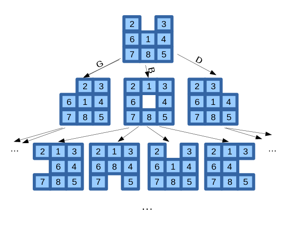 Si n est la longueur de la solution la plus courte (en nombre d’actions), alors l’arbre construit sera de profondeur n. Et si le facteur de branchement (le nombre de fils de chaque nœud) est b, alors le nombre de nœuds sur la dernière couche est b^n. Si b\geq 10 et que la solution est de longueur n\geq 12, alors la taille de cette couche dans la mémoire est de l’ordre du Teraoctet.